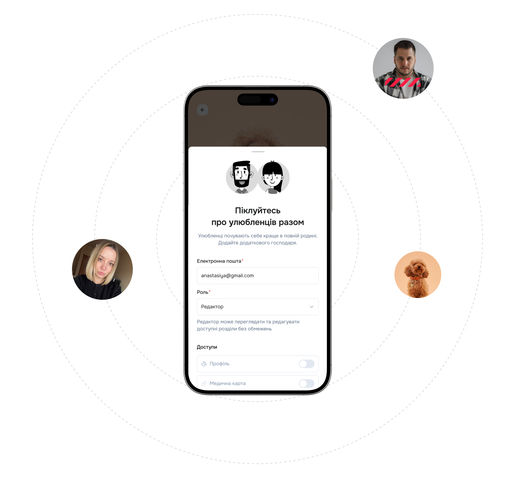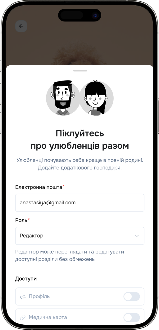 Піклуйтесь про улюбленця разом завдяки спільній опіці. Надайте доступ до даних улюбленця своєму партнеру у ролі переглядача або редактора.